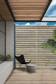 Écran massif à lames horizontales. Montage par emboîtement des tasseaux d’extrémités dans des poteaux rainurés bois ou aluminium. L'écran Linéa pro délimitera vos espaces avec légèreté.