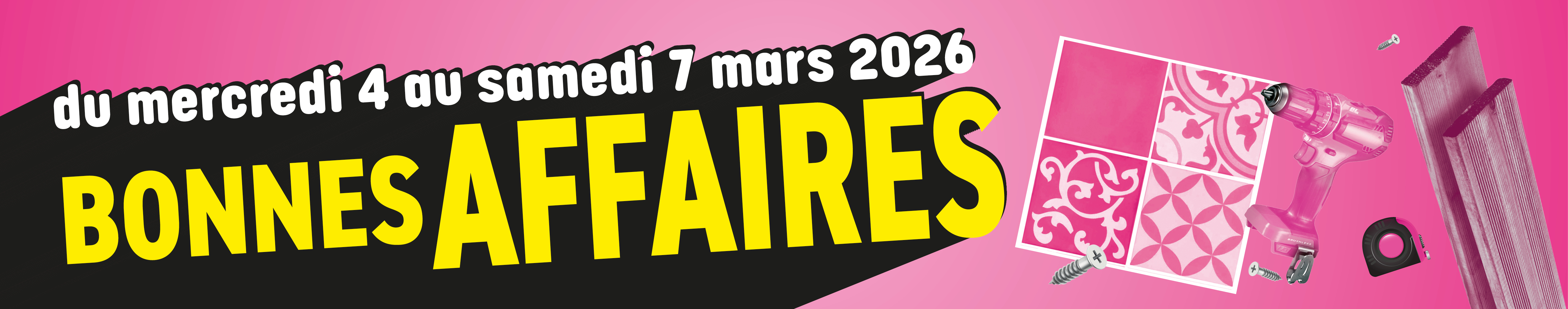 Objectif : profiter de prix exceptionnels sur un grand nombre de références : Sanitaire, Carrelage, Parquet, Aménagement extérieur (Lames de terrasse, carrelage extérieur…) et outillage.
